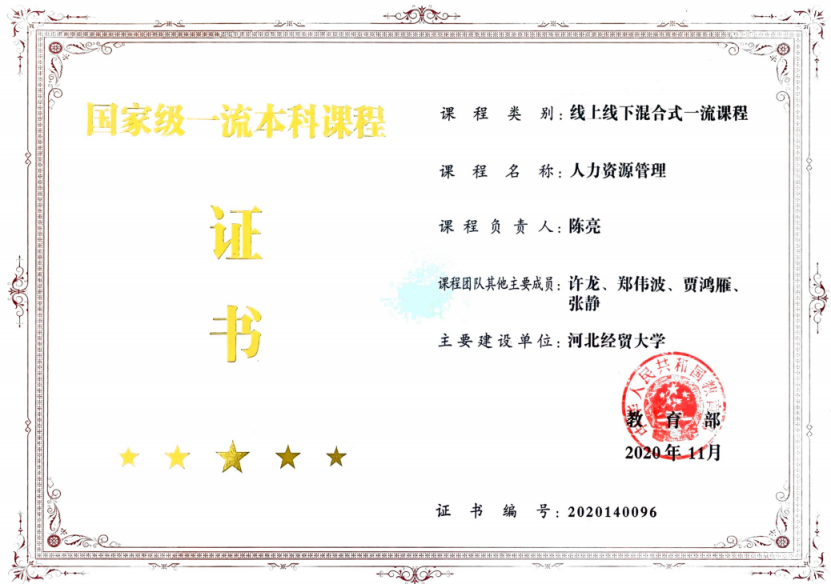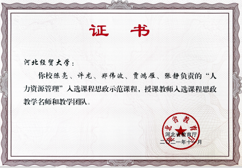 建设成果:2020年专业主干课《人力资源管理》成为首批国家级一流本科课程,2021年人力资源管理课程获批河北省课程思政示范课,人力资源管理教学团队获批省级课程思政教学团队,2023年人力资源管理课程获批省级优秀教学团队。另外《人力资源管理》、《组织行为学》、《管理沟通》、《企业战略与人力资源规划》、《文献阅读与写作》、《薪酬管理》、《组织设计与工作分析》、《人员招聘与选拔》、《人格认知与情商提升》、《人力资本经济学》、《劳动关系》被评为校级思政课程。