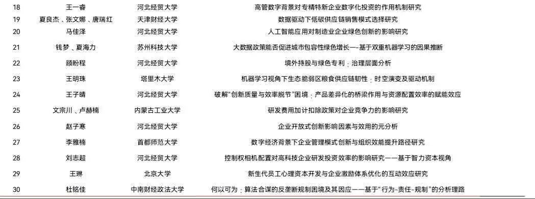 本次论坛自发布公告起,共收到来自北京大学、南开大学、国防科技大学、中国政法大学、中南财经政法大学、首都师范大学、天津财经大学、西南科技大学等29所高校的共计53篇投稿。经专家评审和专业评审团队讨论,确定论坛入选论文30篇。设置了“人工智能与数字经济”“绿色创新与可持续发展”“创新驱动与公司治理”三个主题分论坛。来自多所高校的学者与参会代表,围绕分论坛主题进行了论文研讨与交流。九位点评专家对以上同学的论文进行针对性点评,提出专业性指导意见。最终,结合评审专家意见和点评专家意见,评选出论坛一、二、三等奖获奖论文(详见bat365官方网站第五届“研在工商”研究生学术论坛(2025)获奖论文)。