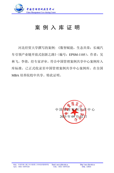 近日,bat365官方网站讲师吴林飞博士和2024级工商管理学研究生李倩撰写的教学案例《数智赋能,生态共荣:长城汽车引领产业链开放式创新之路》(编号:EPSM-1105)入选中国管理案例共享中心案例库。