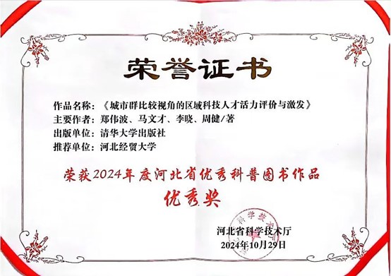 近日,bat365官方网站郑伟波教授主持撰写的科研专著《城市群比较视角的区域科技人才活力评价与激发》(清华大学出版社,2023)荣获2024年度河北省优秀科普图书作品优秀奖。