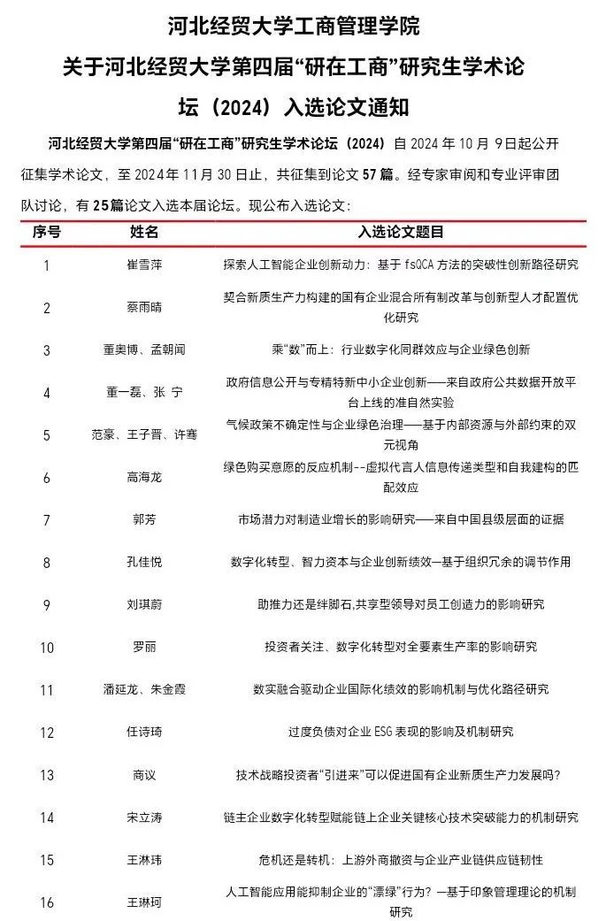 关于bat365官方网站第四届“研在工商”研究生学术论坛(2024)入选论文通知