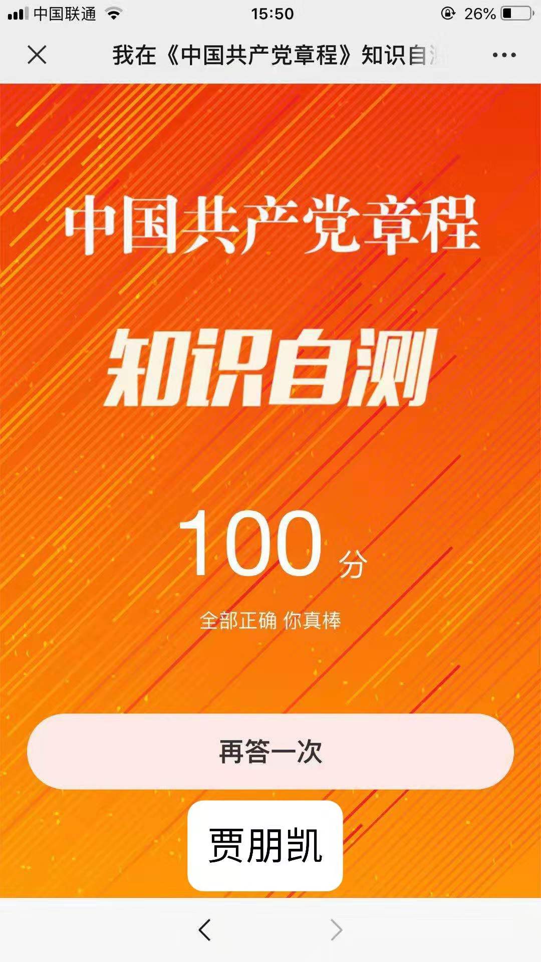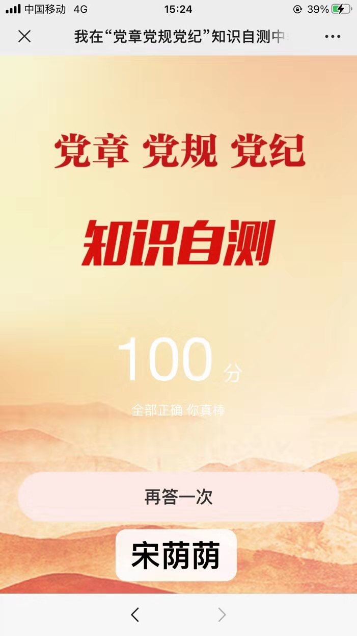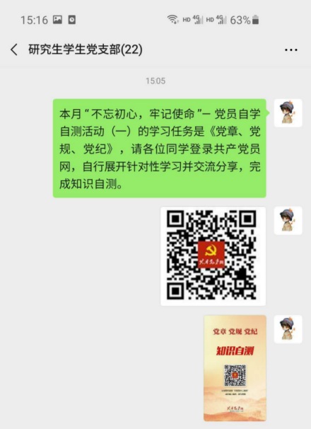 月初,党支部微信群发布学习任务之后,党支部各位党员及积极分子登录共产党员网进行自主的系统学习。各位同学认真学习党章党规全文内容,掌握党章党规的核心要点,并进行自我答题,自我检测。党章是党的总章程,是全党必须遵守的根本行为规范,认真学习党章、熟练掌握党章是党员应尽的义务。自学自测活动充分调动了同学们学习的自觉性和积极性,激发学习热情。随后,各位同学递交了各自的答题成绩和心得体会。刘爽分享,这次系统学习《中国共产党章程》让我更加清晰的了解党的要求,严格按照党章约束自己,时刻用党章党规确立的行为规范衡量自己、检视自己、校正自己。杨凯麟分享,通过此次学习,最大的收获是坚定理想信念,守纪律,讲规矩。平时无论工作学习都要坚决执行党的路线、方针、政策,坚持党的领导,自觉地在思想上、政治上、行动上同党保持一致。
