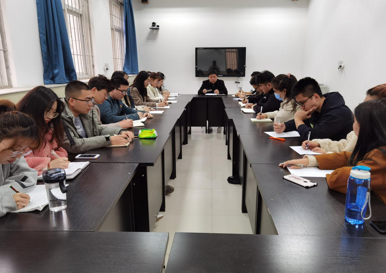 会议伊始,赵国峰书记结合学院探索实施的“五阶递进、师生共育”人才培养机制,特别就“研本对接、双向驱动”——研究生、本科生一体化教育管理新模式做了详细阐释。赵国峰表示,为进一步推动落实立德树人根本任务,充分发挥学院领导、教师党员、辅导员、研究生、优秀学生干部等育人作用,把思想价值引领贯穿教育教学全过程和育人各环节,实现教书、科研、实践、管理、服务“五位一体”育人总目标,助力我校新财经教育改革的理论创新和实践落地,结合“不忘初心、牢记使命”主题教育成果和“一流党建”创建活动成效,经学院研究,创新探索“五阶递进、师生共育”人才培养机制,精准实施“研本对接、双向驱动”——研究生、本科生一体化教育管理新模式。研究生党支部在思想政治教育及党建工作中主动引领,充分发挥研究生党支部的优势和先进性,通过本硕学生党支部工作经验交流、共同开展主题党日活动等形式以及研究生党员与本科生党员结对子,形成学生党建工作合力,使大学生思想政治教育效果进一步凸显。同时,研究生应发挥“大研导”的领航作用,定期深入本科学生班级,就专业认知、学习计划、学习方式、学习效率、考研规划、技巧等方面与学生广泛交流,以研究生主动引领为主导,实现“双向驱动”,引导研究生在参与育人的过程中加强自我教育,形成研本教育管理育人合力。在对接过程中,研究生党员更应注重思想政治教育,加强自我管理,积极对接本科班级“团建”活动,共同完成创新创业类实践项目,创建特色活动等。