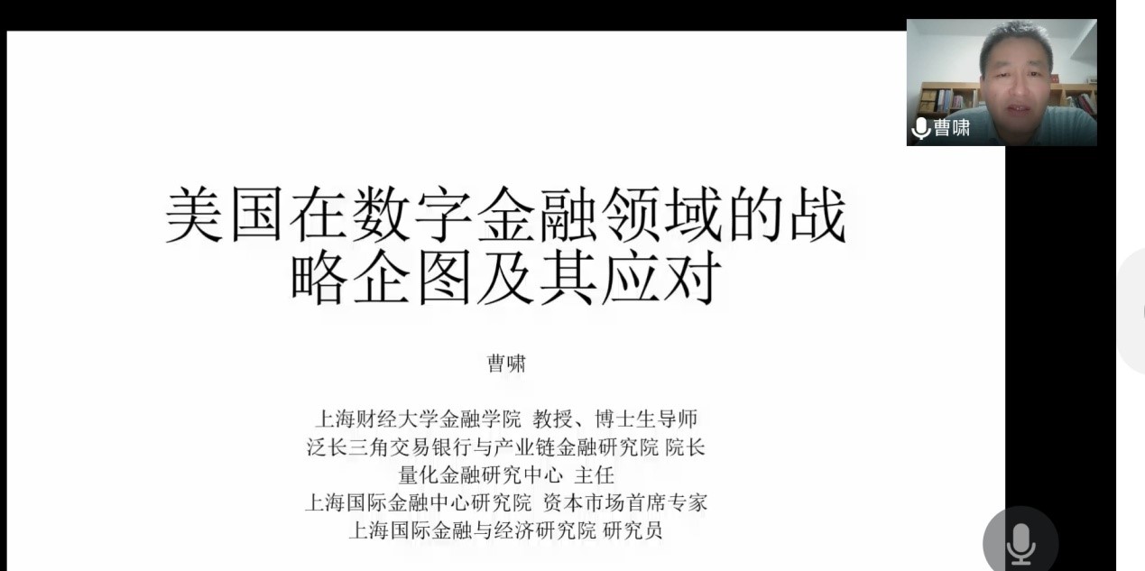 9月5日晚,bat365官方网站邀请上海财经大学金融学院院长助理、上海财经大学量化金融研究中心主任、博士生导师曹啸教授作题为《美国在数字金融领域的战略企图及其应对》的学术报告。报告以腾讯会议形式进行,来自校内外近300名师生和社会人士参加,bat365官方网站院长李桂荣教授主持了报告会。