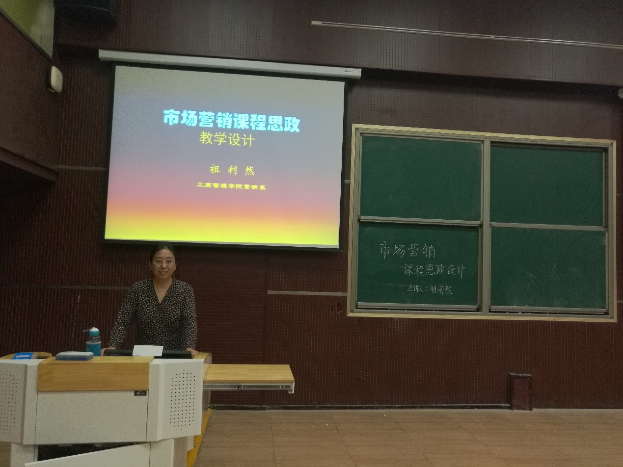 祖利然结合《市场营销学》课程,介绍了市场营销专业课程思政的目标、内容、原则和方法。首先,在思想观念上要确立 “育人”目的,深入学习贯彻习近平新时代中国特色社会主义思想,党和国家在政治、文化、社会、生态及党建方面的相关政策,从中挖掘思政元素,进而结合专业课程谈思想、说素养、讲故事,把思政教育渗透进学习过程的每一环节,包括培养方案、教材选用、课前预习、课堂教学、课后作业、案例讨论、社会实践等方面。其次,在将思政元素融入专业教学,运用马克思主义立场、观点和方法解释相关内容的同时,教师还要注重以德立身、以德立学、以德施教,为学生点亮理想的灯、照亮前行的路。最后,她以“宏观环境分析”一节为例,直观地展示了专业课程思政教学设计方案,并与参会教师进行了交流。