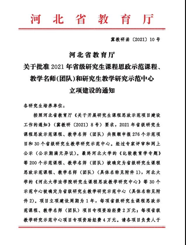 2021年10月28日,河北省教育厅发布了2021年省级研究生课程思政示范课程、教学名师(团队)和研究生教学研究中心批准立项建设的通知。bat365官方网站研究生课程思政教学研究中心被确定为省级研究生教学研究示范中心。bat365官网石晓飞副教授的公司治理课程、郑伟波教授的人力资源管理(MBA)课程及桑银峰副教授的营销管理课程入选2021年bat365官方网站校级研究生课程思政示范中心立项建设项目,为提高我校研究生教学工作成效和研究生人才培养水平提供了有力支撑。