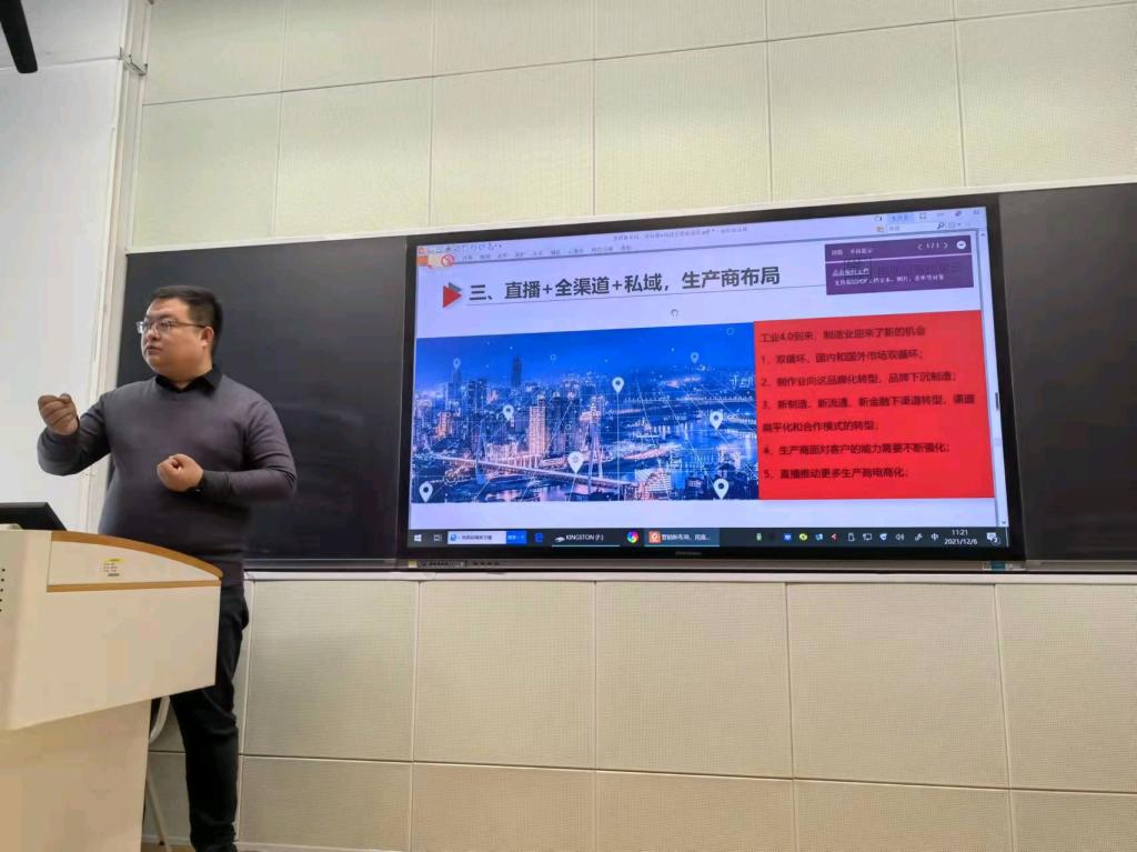 12月6日上午,bat365官方网站邀请河北掌云公司总经理刘志强在北三教A109室为市场营销课的同学作了一场主题为“营销新布局,用直播+构建企业行销新通路”的分享报告。
