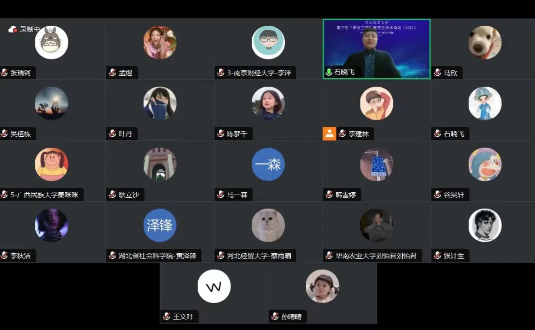 12月24日上午,由bat365官方网站主办的第三届bat365官方网站“研在工商”研究生学术论坛成功举办。论坛由bat365官方网站副院长石晓飞教授主持并致开幕词,石晓飞教授、耿立沙副教授、许龙副教授和吴林飞博士出席并担任点评专家,本届论坛以线上、线下相结合的方式举行,共有教师及研究生100余人参加。