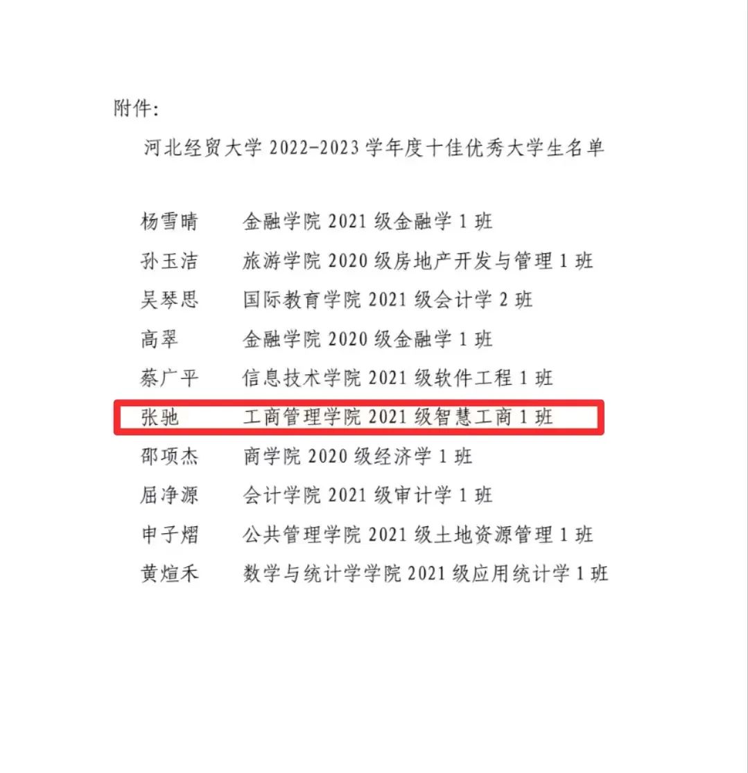 bat365官方网站2021级智慧工商一班学生张驰获得了“bat365官方网站十佳优秀大学生”荣誉称号。