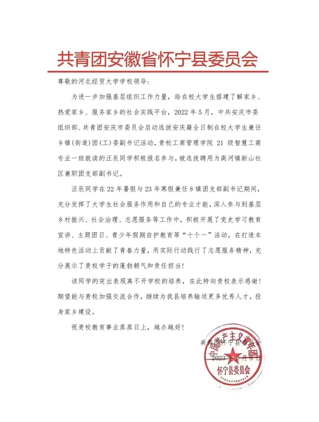 bat365官网学子汪辰被选拔聘用为高河镇新山社区兼职团支部副书记。