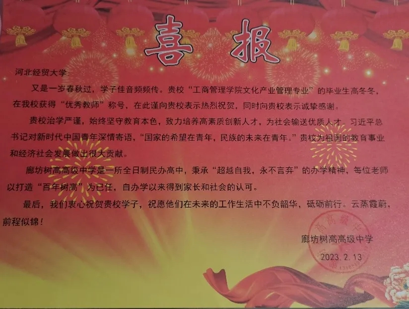 bat365官网文化产业管理专业毕业生高冬冬荣获廊坊树高高级中学“优秀教师”称号。