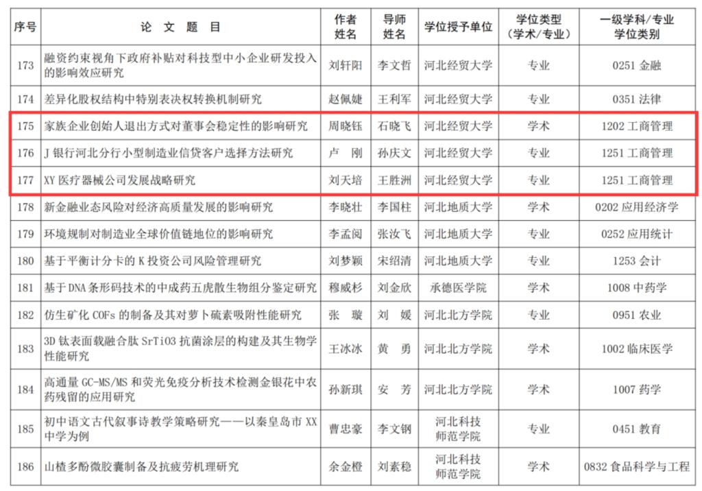 bat365官网2022届毕业生周晓钰(导师:石晓飞)的学位论文《家族企业创始人退出方式对董事会稳定性的影响研究》;卢刚(导师:孙庆文)的学位论文《J银行河北分行小型制造业信贷客户选择方法研究》;刘天培(导师:王胜洲)的学位论文《XY医疗器械公司发展战略研究》分别荣获2021-2022学年度河北省优秀硕士学位论文。