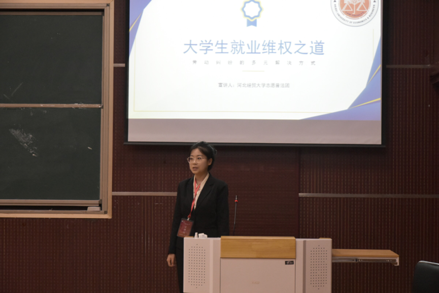 高锦煊以“大学生就业维权之道,劳动纠纷的多元解决方式”为主题,围绕选题的背景与意义、大学生就业陷阱、劳动者的维权路、劳动仲裁案例分析等四个方面展开讲解。她结合实习不算试用期、“三亏协议”不能代替劳动合同、工资拖欠可索赔等三个案例,为同学们展现在就业过程中可能出现的各类侵权现象,鼓励同学们多学习《中华人民共和国劳动法》,明确劳动者的权利和义务,用法律的知识武装自己,维护自己的合法利益,做法律的忠实拥护者和坚定捍卫者。