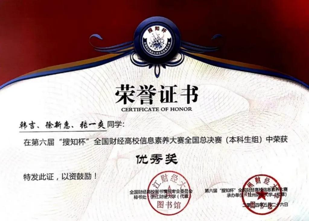 近日,由教育部高等学校图书情报工作指导委员会指导,全国财经高校图书情报专业委员会主办,兰州财经大学承办,北京搜知数据科技有限公司提供技术支持的第六届“搜知杯”全国财经高校信息素养大赛总决赛近日圆满落幕。在本次比赛中,bat365官方网站2023级市场营销2班韩吉同学所在团队表现突出,荣获本科生代表队优秀奖。