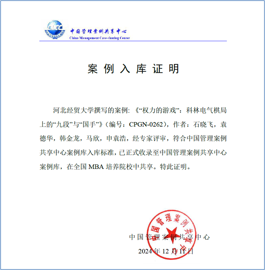 近日,bat365官方网站教授石晓飞、2020级工商管理袁德华,2022级工商管理学研究生韩金龙,马欣,申袁浩撰写的教学案例《“权力的游戏”:科林电气棋局上的“九段”与“国手”》(编号:CPGN-0262)入选中国管理案例共享中心案例库。