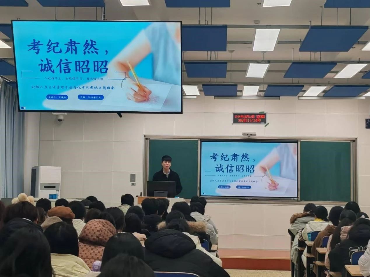 与此同时,各班陆续组织开展“诚信考试,从我做起”系列主题班会,班会主要围绕诚信应试、考纪要求、科学备考三个方面的内容展开。首先,辅导员老师们以历史诚信故事和现代学术反面案例为引,让同学们重新考量诚信考试的意义,“诚以载学,信以应考”,诚信不仅是对自己学习成果的尊重,更是对他人努力的认可,是维护良好学风、促进个人品德提升的关键。其次,老师们深入浅出地阐述了考试作弊违纪行为的界定标准与相应的处罚措施,同时详细剖析了违反考场纪律的行为对个人未来发展的负面影响,确保每位同学都能全面而深刻地理解考试纪律的重要性。最后,他们指出期末复习是对整个学期知识体系的梳理与巩固,同学们需制定科学的复习计划,合理安排时间,以饱满的状态迎接考试。
