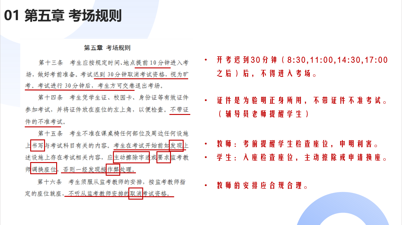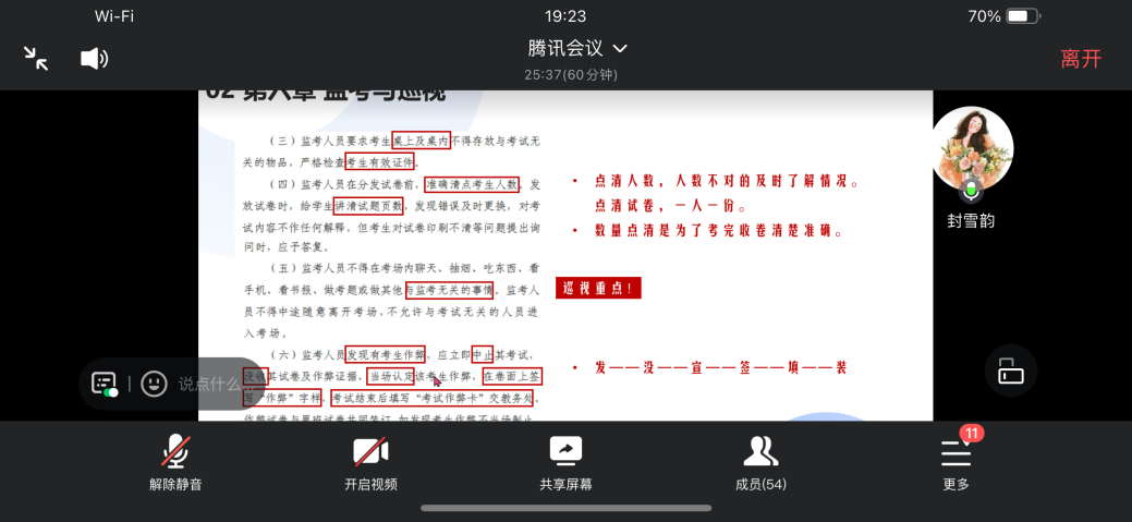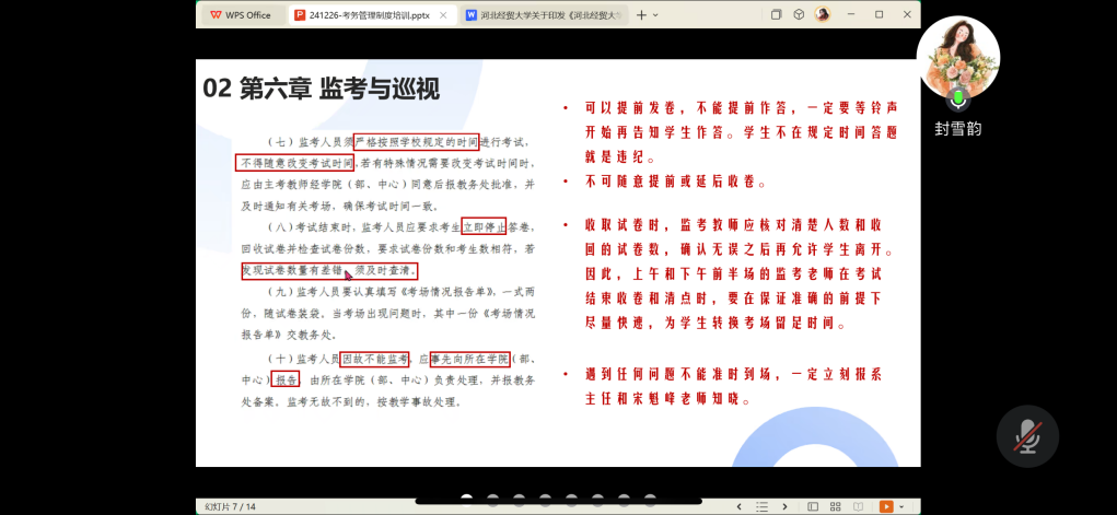 封雪韵聚焦《bat365官方网站普通本科教学考务管理制度》,从考场规则、监考与巡视和考试纪律等3方面带领全体教师认真学习《制度》的第五、六、七章。她首先详细解读考场规则,对考场环境布置、考生座位安排、考试时间把控等细节进行明确规范,确保考试的严肃性与规范性。然后,她详细讲解了监考教师的监考职责与工作流程,从考前检查、证件核对,到考中监考、突发事件处理,以及巡视员的巡查重点与路线规划,确保全方位保障考试秩序。在考试纪律部分,她着重解读违纪和作弊的认定办法,帮助老师们清晰界定如携带违规物品、抄袭、协助作弊等各类行为的表现形式与判别标准,有利于大家准确把握尺度,做到纪律严明、评判有据。