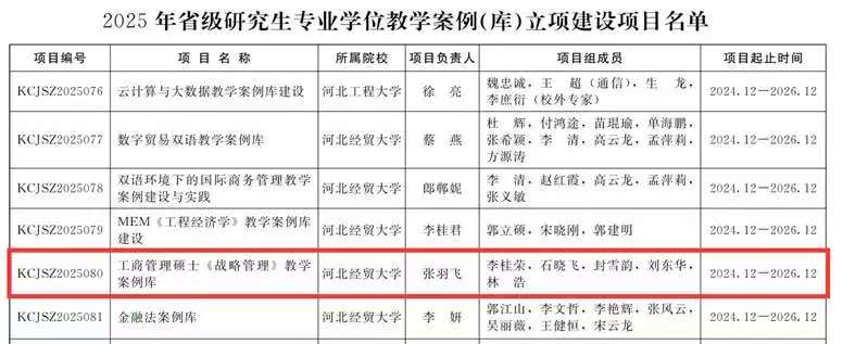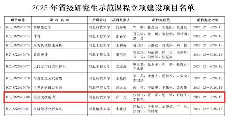 bat365官网教师许龙副教授主持的《英文文献阅读》获批2025年省级研究生示范课程立项和张羽飞博士主持的《工商管理硕士<战略管理>教学案例库》获批2025年省级研究生专业学位教学案例(库)立项建设项目。