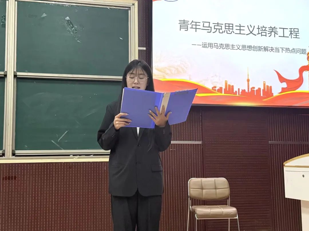 活动伊始,主持人姜佳怡围绕数字时代的劳动形式、生态危机治理等热点议题,运用马克思主义的辩证唯物主义与历史唯物主义视角,剖析了技术革命、社会不平等等问题的本质,并强调“两个结合”对理论创新的指导意义。随后,学员们迅速分组,围绕马克思主义方法论就“绿水青山就是金山银山”,AI人工智能的飞速发展等热点问题展开讨论。大家各抒己见、深入交流,思想碰撞间,学员们不仅深化了对马克思主义理论的理解,更在团队协作中培养了辩证思维。讨论结束后,学员代表张典艺上台发言,紧扣“用马克思主义创新解决当下热点问题”主题,阐述运用马克思主义理论化解现实难题的实践路径与创新思路,这不但充分展示了学员们的学习成效,而且在交流分享中营造了“以讲促学、以学促行”的良好氛围,进一步激发了青年学子用理论破解现实问题的使命感。
