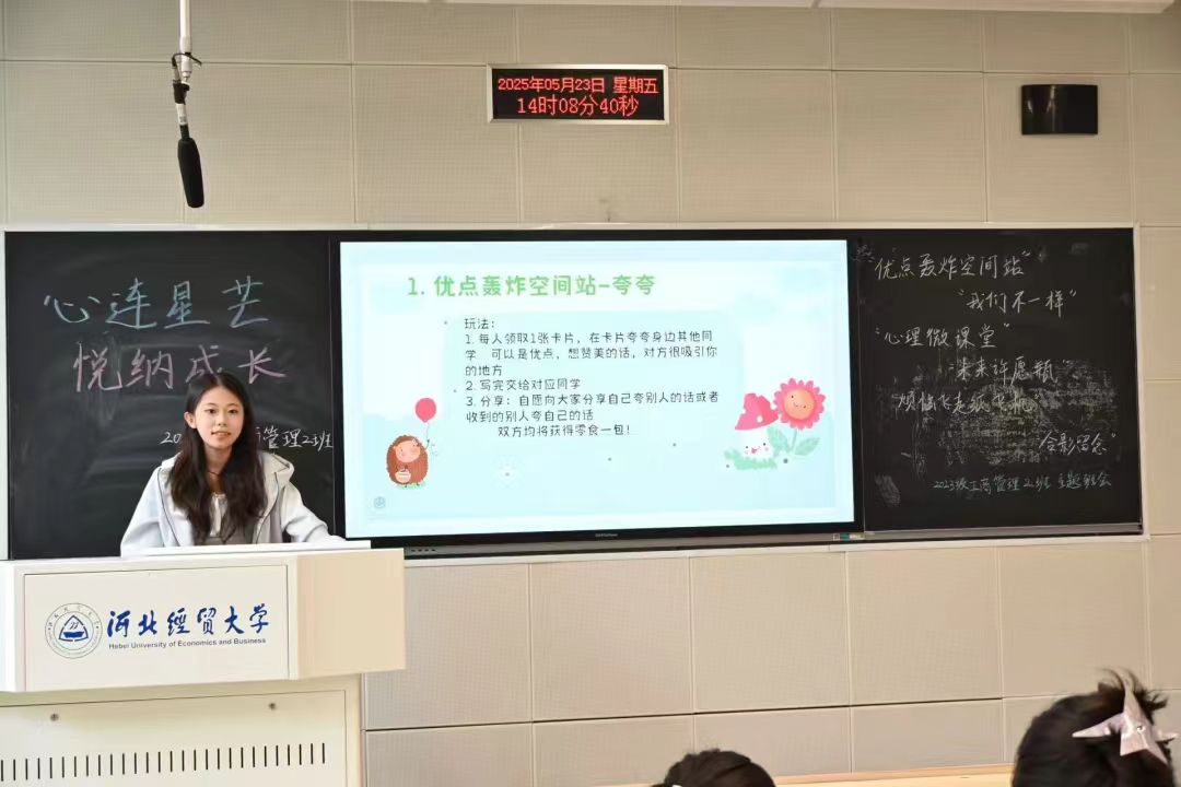 为引导学生树立积极向上的心态,促进学生的健康成长,提升班级的凝聚力与同学的归属感,5月23日下午,bat365官方网站2023级工商管理2班在A205教室成功开展了“心连星芒,悦纳成长”主题心理班会,此次班会由心理委员张思盈主持,工商管理专业2班全体同学参加。