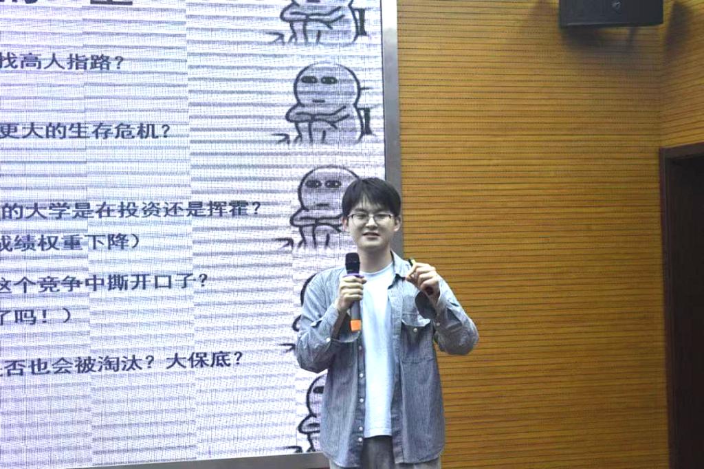 在分享环节,李子康以诙谐生动的语言深入剖析了考研深造、求职就业、自主创业等常见毕业去向的利弊,帮助同学们理性规划未来。与此同时,李子康结合自身丰富的实习经历,以生动鲜活的案例,深入强调实习对职业发展的重要性。他通过回顾自己在不同实习岗位上的成长历程,清晰地展现出实习不仅能帮助同学们提前了解行业实际需求,更能在真实的职场场景中快速培养各项核心能力,是连接校园与职场的重要桥梁。对此,他建议同学们应尽早规划实习时间线,大一大二可尝试基础岗位积累经验,大三则需聚焦与未来职业方向高度匹配的实习岗位,通过精准的实践逐步明确职业目标,确保每一段实习经历都能为职业发展助力,以“井”型人才标准为导向,实现多领域协同发展,为踏入职场做好充分准备。