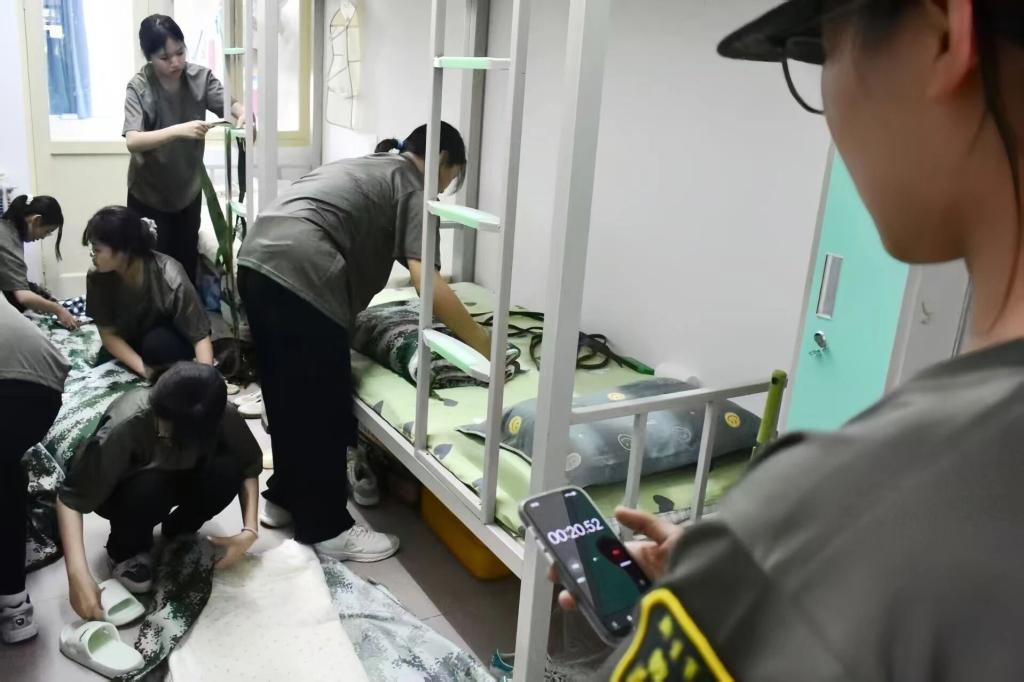 军训教官在各宿舍间巡回观察,一边实时记录每位同学的完成时间,一边逐床检查被子的规整度。比赛结束后,教官根据“速度”与“质量”双重标准,综合评定各宿舍的整体成绩,当场公布获胜宿舍,并鼓励大家:“这场比赛,既考验了大家的叠被技巧,也展现了各宿舍的整体风貌,希望大家继续保持这份认真,在接下来的训练中也能突破自我。”