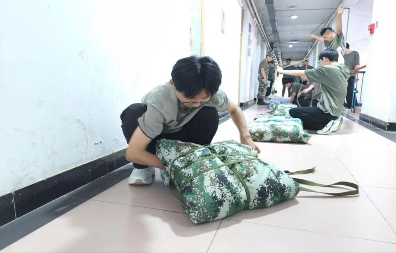 同学们严格遵照军训叠被标准,各自在床前站定就绪。随着教官一声令下,叠被团体赛正式开始,大家立刻投入状态,争分夺秒地铺平被面、压实边角、叠出规整形状。每个人都专注于自己的动作,手指快速整理被角,眼神紧盯叠被线条,全力朝着“又快又好”的目标冲刺。