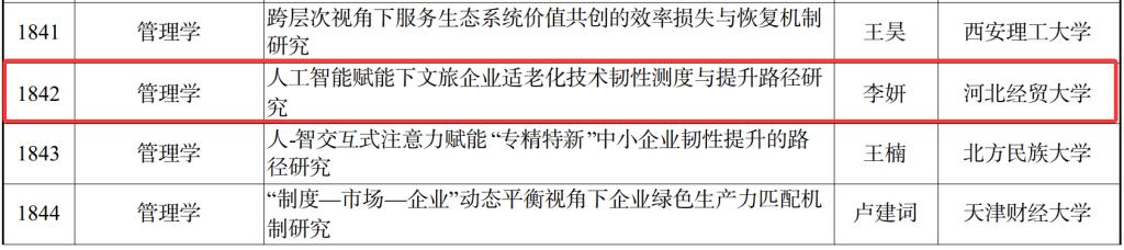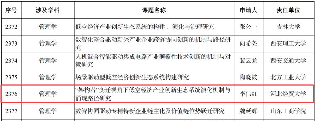 9月5日,全国哲学社会科学工作办公室发布《关于2025年国家社会科学基金年度项目立项名单的公示》,bat365官方网站李伟红教授主持的《“架构者”变迁视角下低空经济产业创新生态系统演化机制与涌现路径研究》项目获国家社科基金一般项目立项、李妍博士主持的《人工智能赋能下文旅企业适老化技术韧性测度与提升路径研究》项目获国家社科基金青年项目立项。
