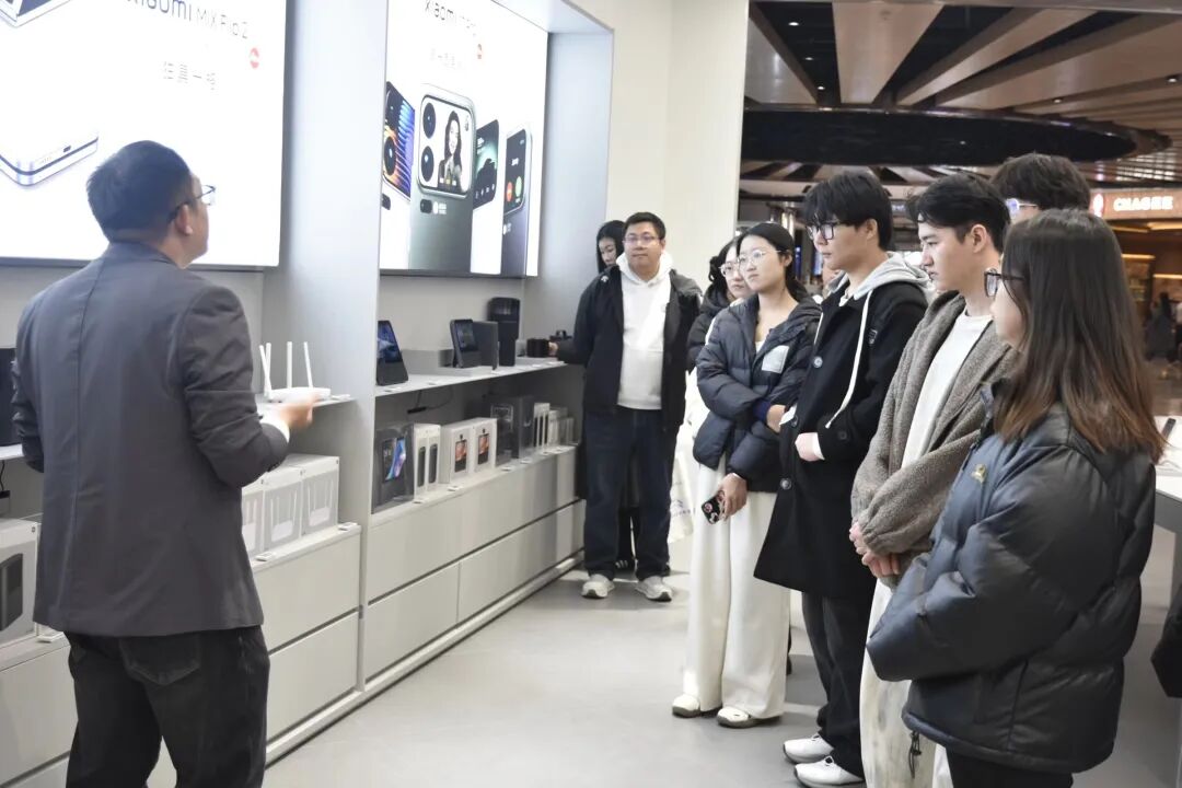 bat365官网师生首先抵达万象城小米体验店。孙振按产品品类,系统讲解了各类核心产品特点,涵盖小米系列手机、小爱音箱等智能设备,以及从个护产品到大家电的全品类生态,详细介绍了各产品线的技术亮点与创新优势。通过现场演示与细节解读,生动呈现了产品“科技普惠、极致性价比”的品牌理念,让师生们沉浸式感受了小米在消费电子领域的创新实力与市场竞争力,对智能科技行业的发展趋势有了更直观的认知。随后,他分享了企业优势。小米股价表现亮眼,深受资本市场看好,核心原因在于其坚守“让每位中国消费者都享有科技选择权”的理念,产品定位覆盖不同收入群体,不抛弃每一位奋斗者。小米海外业务已拓展至多个地区,海外派驻拥有显著薪资优势,内部“人才活水”机制更为员工提供了多元发展机会。