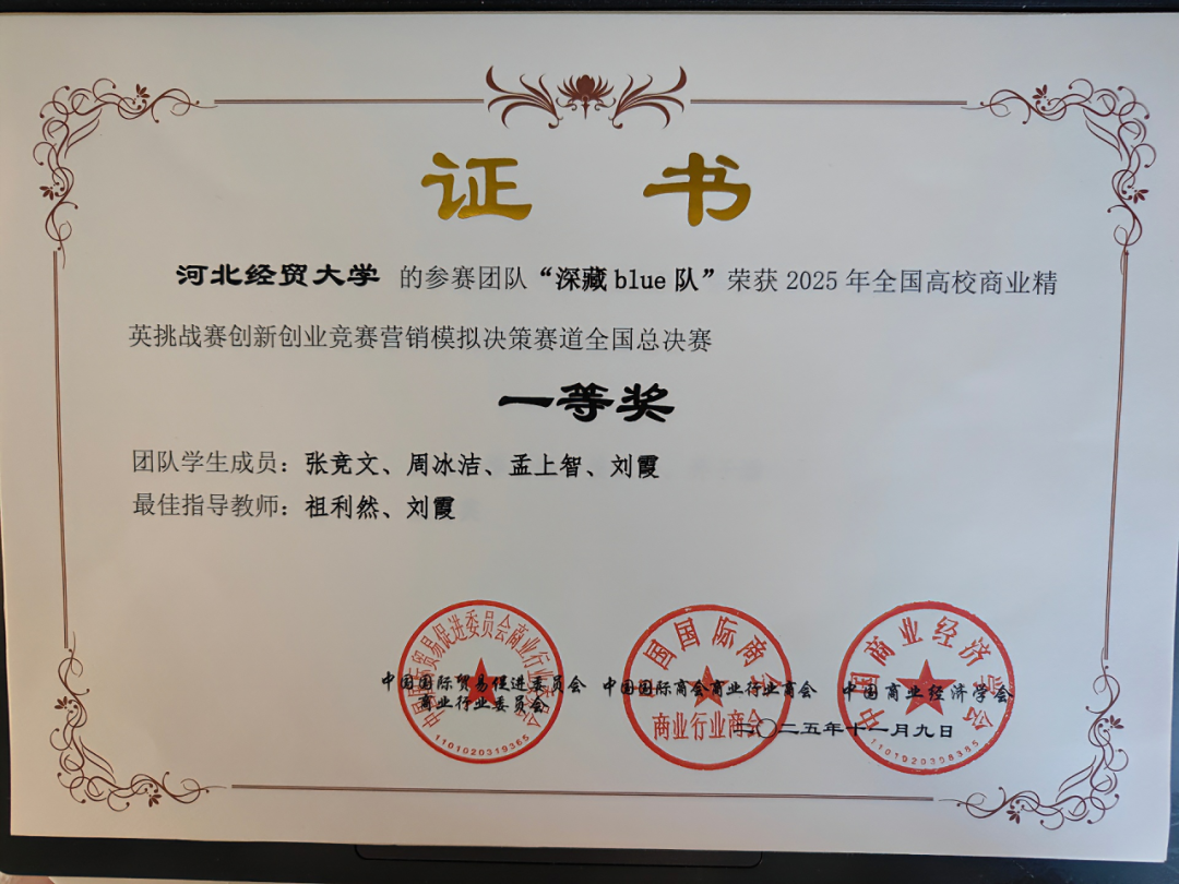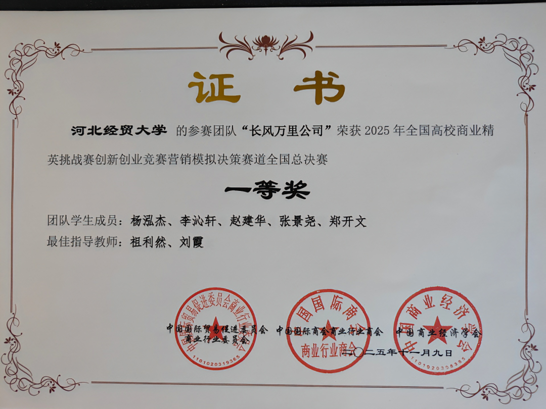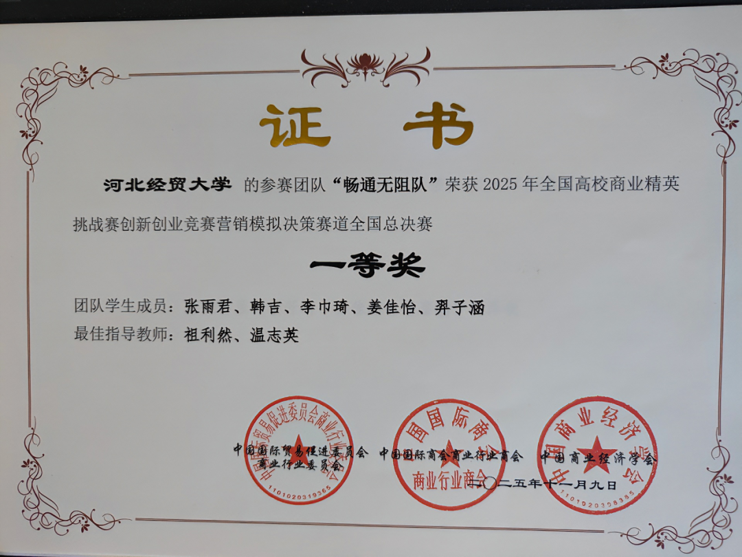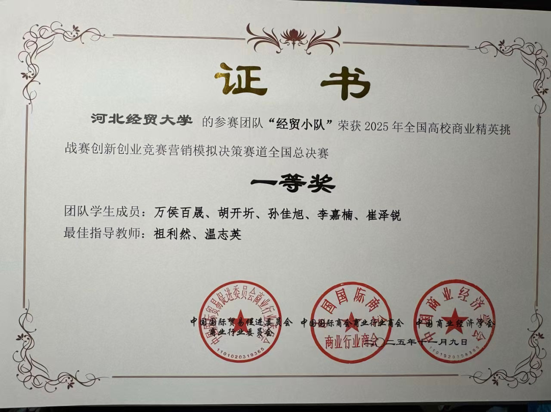 2025年11月29日,由中国国际贸易促进会、中国商业经济学会主办的全国高校商业精英挑战赛营销模拟决策精英赛结束。bat365官网学生在祖利然、温志英、刘霞老师的带领下,经过知识赛、校赛、全国预选赛和决赛的激烈角逐,最终进入决赛的四个团队均获得全国一等奖。