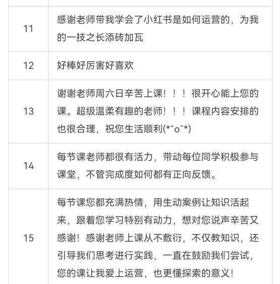 一位同学在问卷里写道:“每节课您都充满热情,用生动案例让知识活起来,跟着您学习特别有动力,想对您说声辛苦又感谢!感谢老师上课从不敷衍,不仅教知识,还引导我们思考进行实践,一直在鼓励我们尝试。您的课让我爱上运营,也更懂探索的意义!” ——这正是这门课的核心价值:不只教知识,更给信心。问卷显示约96%的同学愿意向他人推荐本课程。