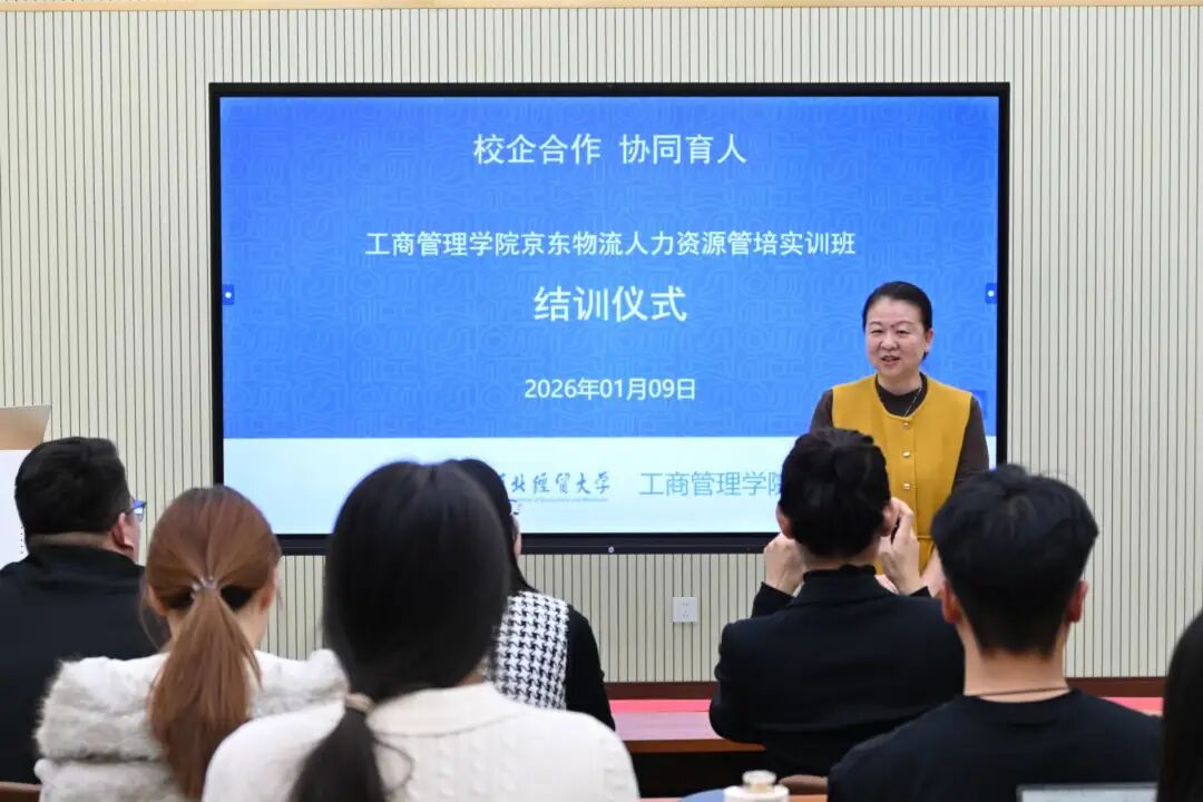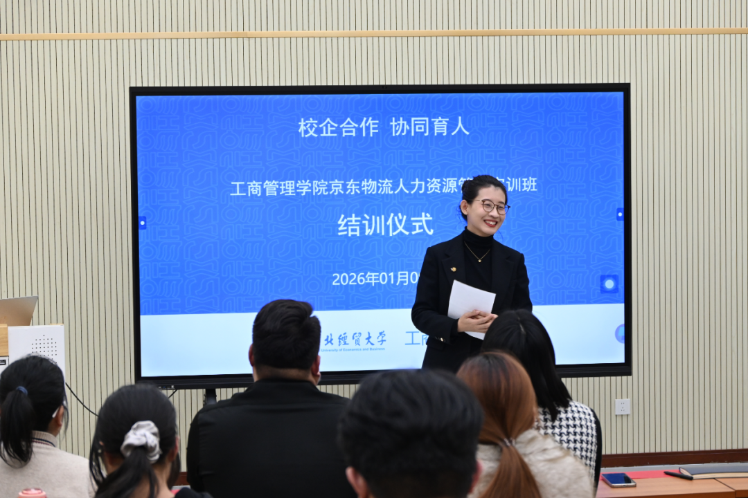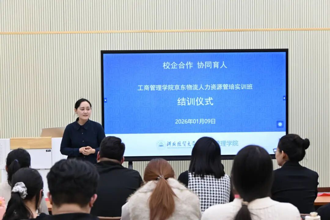 下午,实训结业仪式顺利举行,人力资源系副主任史淑秀主持仪式。院党委副书记宋欣高度赞许了京东物流三位企业导师的辛勤付出,指出本次实训为学校深化校企合作、创新实践育人模式树立了良好示范,鼓励同学们以此为起点,持续主动参与各类校企合作项目,提升综合素养与实践能力。副院长封雪韵诚挚感谢了企业导师的鼎力支持,充分肯定了专业教师的育人担当及学员们潜心钻研、协作奋进的良好风貌与成长蜕变,希望大家将实训收获转化为个人核心竞争力,在职业道路上稳步前行。河北京东物流企业导师李少鹏表示,本次校企合作以培养学生综合能力为目标,也为企业发掘和储备了优秀人才,实现了校企双方优势互补、合作共赢。人力资源管理系教师党支部书记赵娜回顾了学员们的成长历程,高度评价了实践教学对学生成长的积极作用。系主任王丽媛结合自身经历分享感悟,引导学员们从长远角度规划职业发展,鼓励大家利用寒假明确方向,为未来求职与职业发展夯实基础。仪式上,五名学员代表依次发言,围绕团队协作、专业技能提升以及职业认知等不同维度分享了实训收获,充分展现了实训班的育人成效。