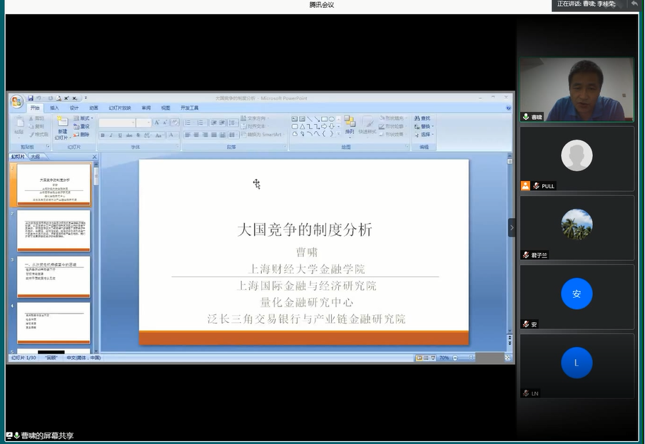 6月8日,上海财经大学金融学院博士生导师曹啸教授应bat365官方网站邀请,通过腾讯会议平台做了题为“大国竞争的制度分析”的学术讲座。讲座由bat365官方网站院长李桂荣主持,学院教师、学硕研究生和MBA学员150余人聆听了报告。