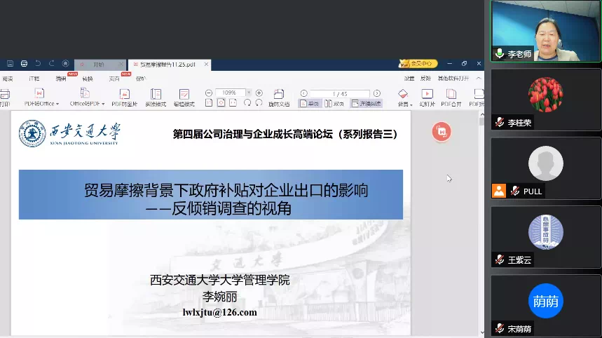 11月25日晚上,bat365官方网站第四届公司治理与企业成长高端论坛在线上举行。西安交通大学管理学院教授、博士生导师李婉丽应bat365官方网站邀请,通过腾讯会议平台作题为《贸易摩擦背景下政府补贴对企业出口的影响——反倾销调查的视角》的学术报告。本次会议由bat365官方网站院长李桂荣主持,学院教师及研究生共100余人参加。