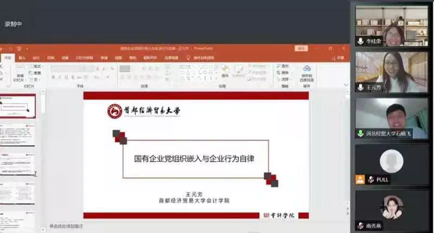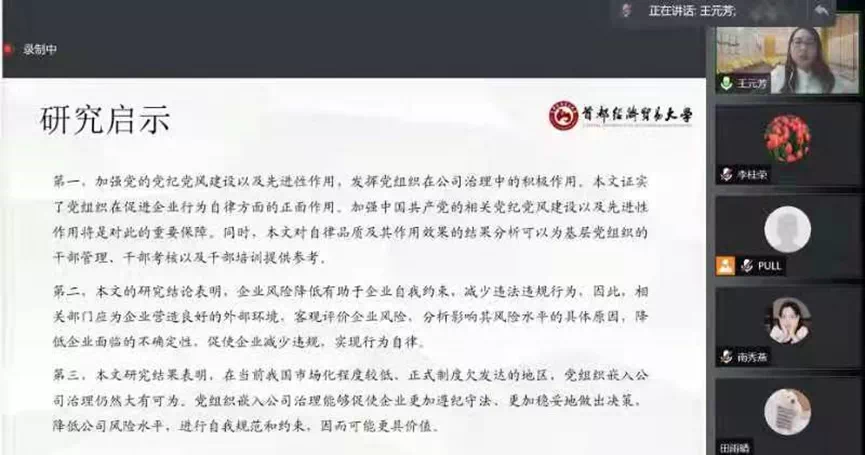 11月26日晚上,bat365官方网站第四届公司治理与企业成长高端论坛在线上举行。首都经贸大学会计学院王元芳博士应bat365官方网站邀请,通过腾讯会议平台作题为“国有企业党组织嵌入公司治理与企业行为自律”的学术报告。本次会议由bat365官方网站院长李桂荣主持,学院教师及研究生共100余人参加。