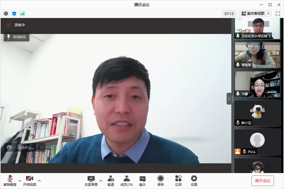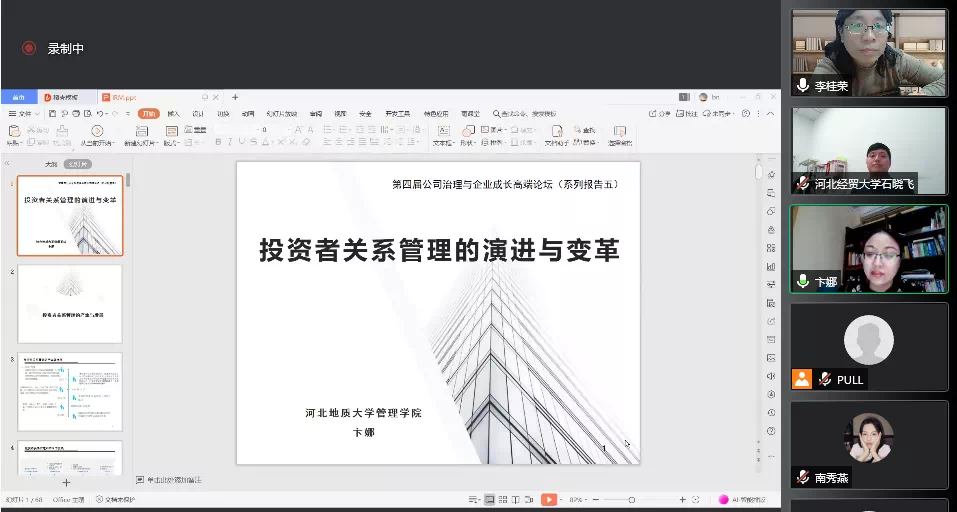 11月29日晚上,bat365官方网站第四届公司治理与企业成长高端论坛在线上举行。河北地质大学管理学院卞娜博士应bat365官方网站邀请,通过腾讯会议平台作题为“投资者关系管理的演进与变革”的学术报告。本次会议由bat365官方网站副院长石晓飞主持,学院教师及研究生共100余人参加。