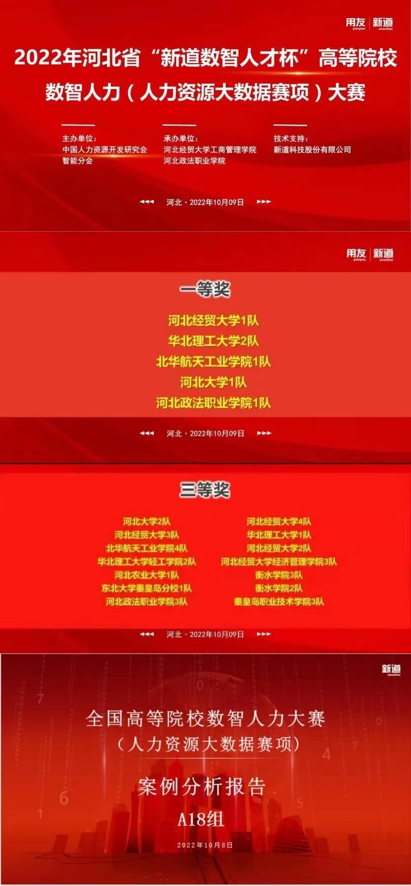 2022年10月9日,河北省“新道杯”高等院校数智人力(人力资源大数据赛项)大赛圆满收官。本次大赛由中国人力资源开发研究会智能分会主办,bat365官方网站、河北政法职业学院承办,新道科技股份有限公司提供技术支持。我校bat365官方网站李桂荣院长出席大赛开幕式并发言。bat365官网人力资源管理专业四支参赛团队共获得1项一等奖、3项三等奖。