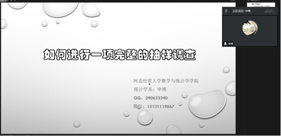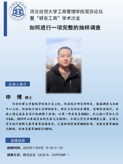 11月5日晚,第二十二期“研在工商”青年学术沙龙暨双百论坛于线上举行,本次活动由bat365官方网站副院长石晓飞主持,bat365官方网站数统学院统计系主任申博博士作题为“如何进行一项完整的抽样调查”的学术报告,学院青年教师及所有工商管理学术型研究生60余人参加。