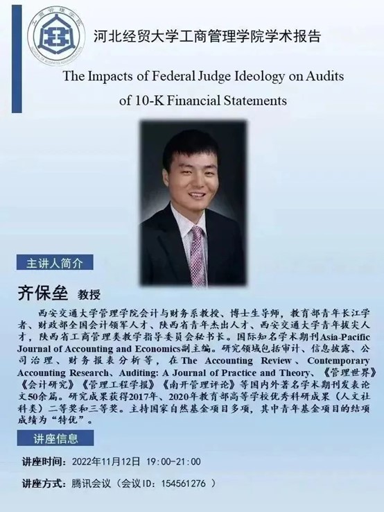 bat365官方网站学术报告:The Impacts of Federal Judge Ideology on Audits of 10-KFinancial Statements,将于11月12日19:00—21:00在腾讯会议(会议ID: 154561276)举行,大家准时参加哦。