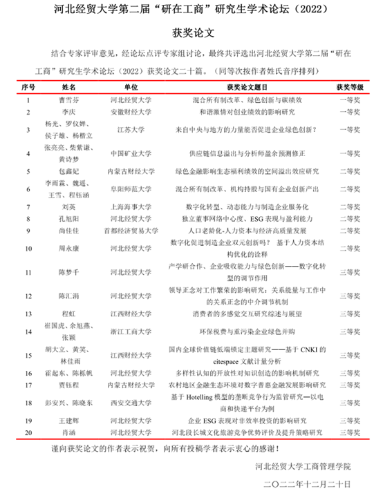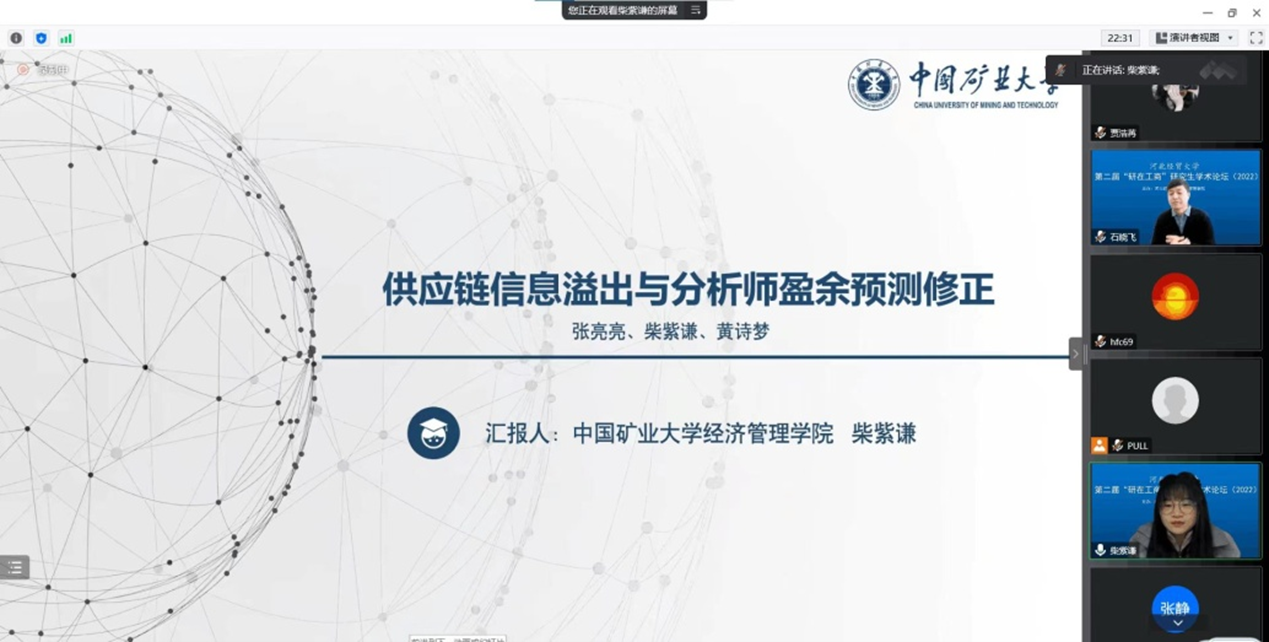 此次论坛自发布公告起,共收到来自西安交通大学、北京科技大学、中国矿业大学、浙江工商大学、首都经济贸易大学、江西财经大学等17所高校的45篇论文,其中8篇进行线上报告,包括中国矿业大学柴紫谦、首都经济贸易大学尚佳佳、安徽财经大学李庆、阜阳师范大学李雨霖、江苏大学杨光、bat365官方网站孔旭阳、周永康、曹雪芬的论文。四位评委专家对以上八位同学的论文进行了针对性点评,提出了专业性指导意见。最终,结合评审专家意见和点评专家意见,评选出一、二、三等奖共20篇。