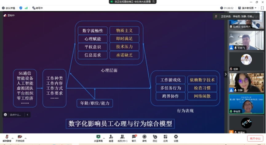 段锦云教授以AI对人们生活的影响为切入点,围绕数字化背景下的人的心理、行为与职业发展展开讨论。他首先指出,数字化转型是组织和社会发展的新趋势,其中AI、大数据、移动物联、5G等技术备受关注,人们的基本生产和生活方式也在发生深刻变化。其次,在人的心理层面,数字技术提升员工能力,促进积极自我评价,同时也增强物质主义倾向,带来技术压力,从而导致工作倦怠和组织承诺降低。再次,在人的行为层面,员工既展现出工作游戏化、多任务处理和跨国协作的适应性行为,但又过度依赖数字技术,产生沉迷、网络闲散等问题。最后,段教授总结了数字化对员工心理和行为的影响,并提出了未来研究应注意的问题。他认为,关于数字化的研究仍处于发展阶段,未来的研究应关注数字化经验差异、区分行为动机、强调高级认知功能以及关注员工的主动行为等方面。