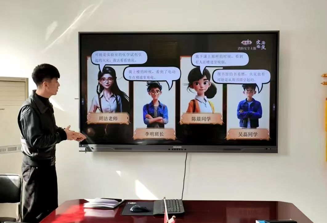 随后,他以“火灾的应急处理”为主题进行了模拟班会展示。为避免传统的讲座式班会,提高学生的互动感和参与感,班会采用了深受年轻人喜爱的剧本杀形式。同学们可以通过角色扮演的形式分组沉浸式体验火灾场景,选择正确逃生路线、灭火方式,从而获得通关密钥。在此过程中,同时穿插视频展示、自编舞蹈或歌曲等趣味性互动来实现教育的目的。