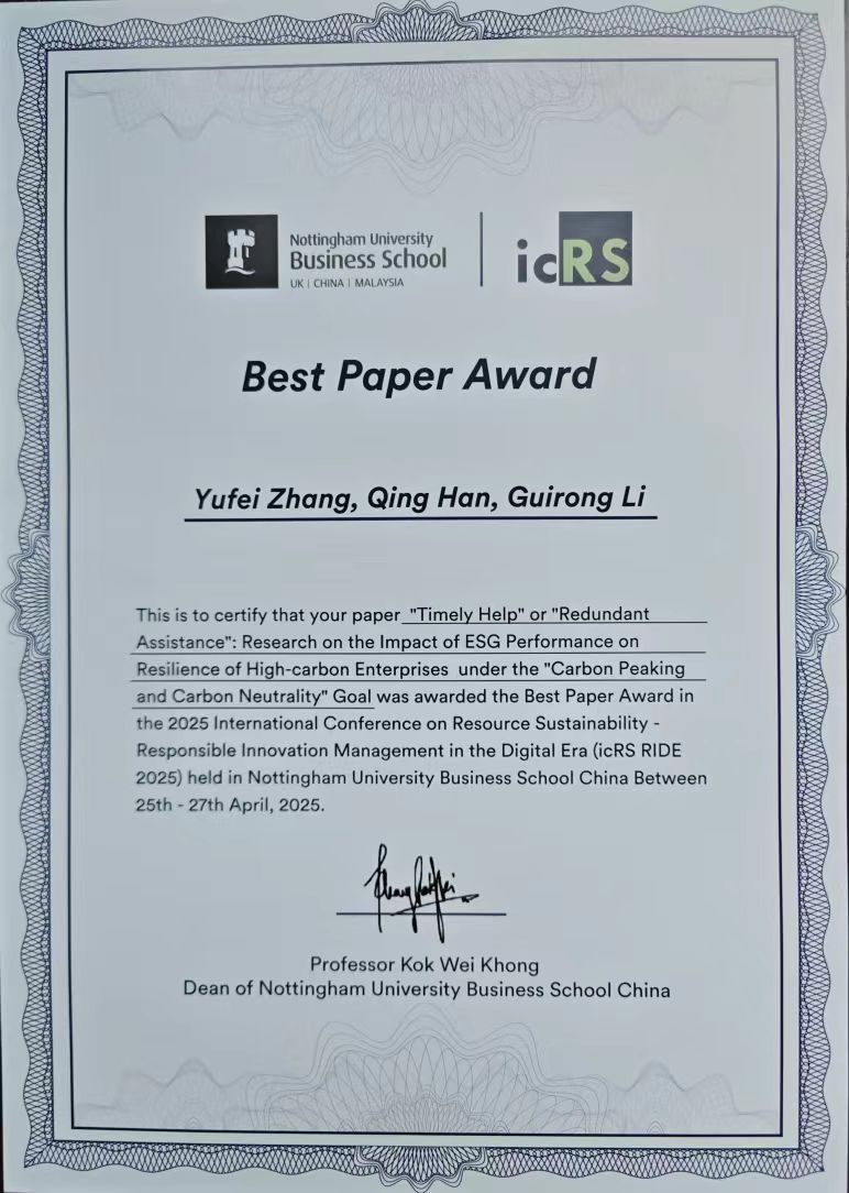 4月26日至27日,bat365官网青年教师张羽飞博士、李桂荣院长应邀参加了在宁波诺丁汉大学举办的第十届资源可持续发展国际会议专题会议“数字时代的企业责任和创新管理”(icRS RIDE 2025),汇报交流入选论文并荣获会议优秀论文奖。
