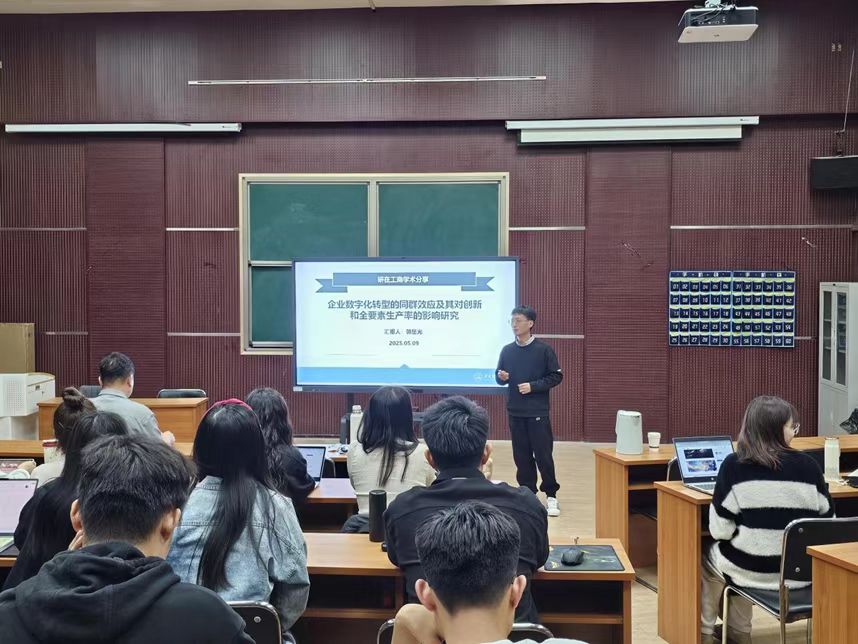 5月9日,研究生学术节系列活动之第四十期“研在工商”青年学术沙龙于MBA一教室举行,由bat365官方网站郭星光博士作题为“企业数字化转型的同群效应及其对创新和全要素生产率的影响研究”的学术报告。本次沙龙由bat365官方网站副院长石晓飞教授主持,学院青年博士教师及全体学术型研究生参加。
