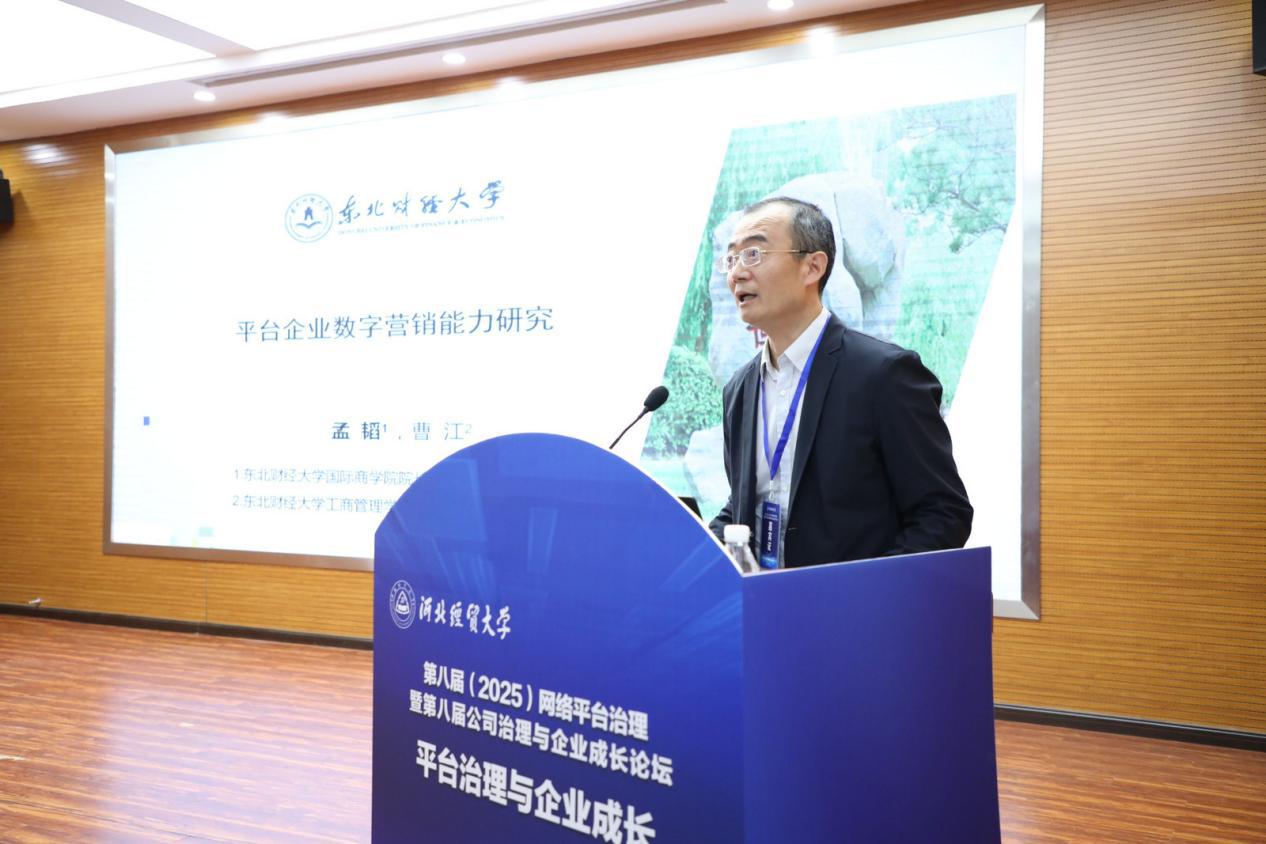 东北财经大学国际商学院院长孟韬教授作题为“平台企业数字营销能力研究”的主题报告。该研究基于动态能力理论、平台生态系统理论以及实践基础理论,运用多源文献数据与企业调研数据进行了实证检验,研究了平台企业数字营销能力的概念维度、测量方法、前因及其对数字营销绩效的影响机制。其创新之处在于理论整合与方法创新,即通过质性元分析构建了数字营销能力的多维结构,并开发出具有良好信效度的测量量表,为数字营销能力的理论建构与实证研究提供了系统框架。