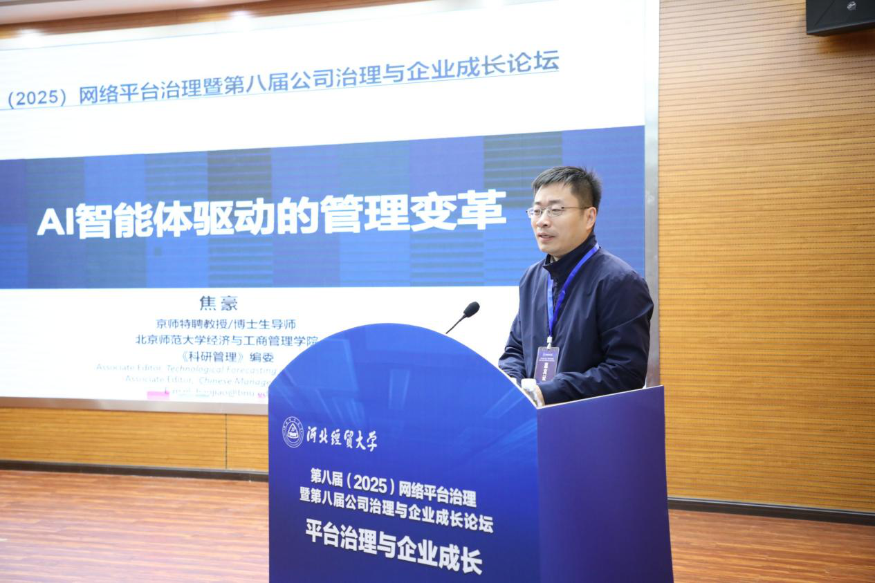 北京师范大学经济与bat365官方网站焦豪教授作题为“AI智能体驱动的管理变革”的主题报告。焦豪教授首先系统分析了工业经济、数字经济、人工智能三个时代的竞争优势逻辑演变,结合平台企业案例及相关学术研究成果,阐释了AI智能体对网络效应的延伸作用及其对数字平台生态的影响。随后深入分析了AI智能体对公司治理、战略管理、组织结构、营销管理以及人力资源等企业管理各领域的具体影响,并提出了AI在企业管理中的“扎根、限定、重塑”三大应用路径。关于未来研究方向,焦豪教授提出了多元化的本土化拓展建议,包括探索“管理者-AI-员工”三方关系的新型管理逻辑、研究AI对数字初创企业商业模式的影响、分析组织与AI双向互动机制,以及解决人机协同决策中的责任界定等关键问题。