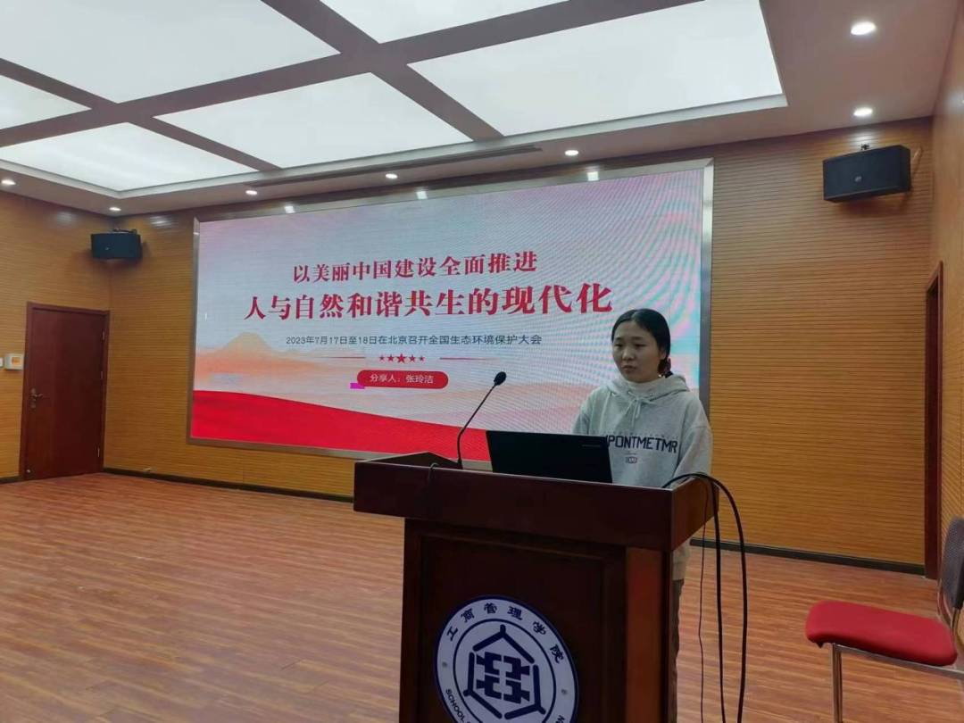 2023级工商管理专业研究生张玲洁作为主讲人,深入探讨了“以美丽中国建设全面推进人与自然和谐共生的现代化”这一主题。张玲洁的演讲不仅加深了同学们对生态文明建设的理解,还激发了他们对于推动人与自然和谐共生现代化进程的热情。首先引用了二十大报告的内容,明确了到2035年我国发展的总体目标,其中包括“广泛形成绿色生产生活方式,碳排放达峰后稳中有降,生态环境根本好转,美丽中国目标基本实现”。她强调,这些目标的实现,需要每一位公民的参与和努力,尤其是即将步入社会的研究生们。接着,引用习近平总书记重要讲话,强调要统筹各领域资源,汇聚各方面力量,打好法治、市场、科技、政策“组合拳”,为美丽中国建设提供基础支撑和有力保障。最后,张玲洁指出,人不负青山,青山定不负人。每个人都要做生态文明建设的实践者、推动者,促进人与自然双向奔赴、和谐共生。